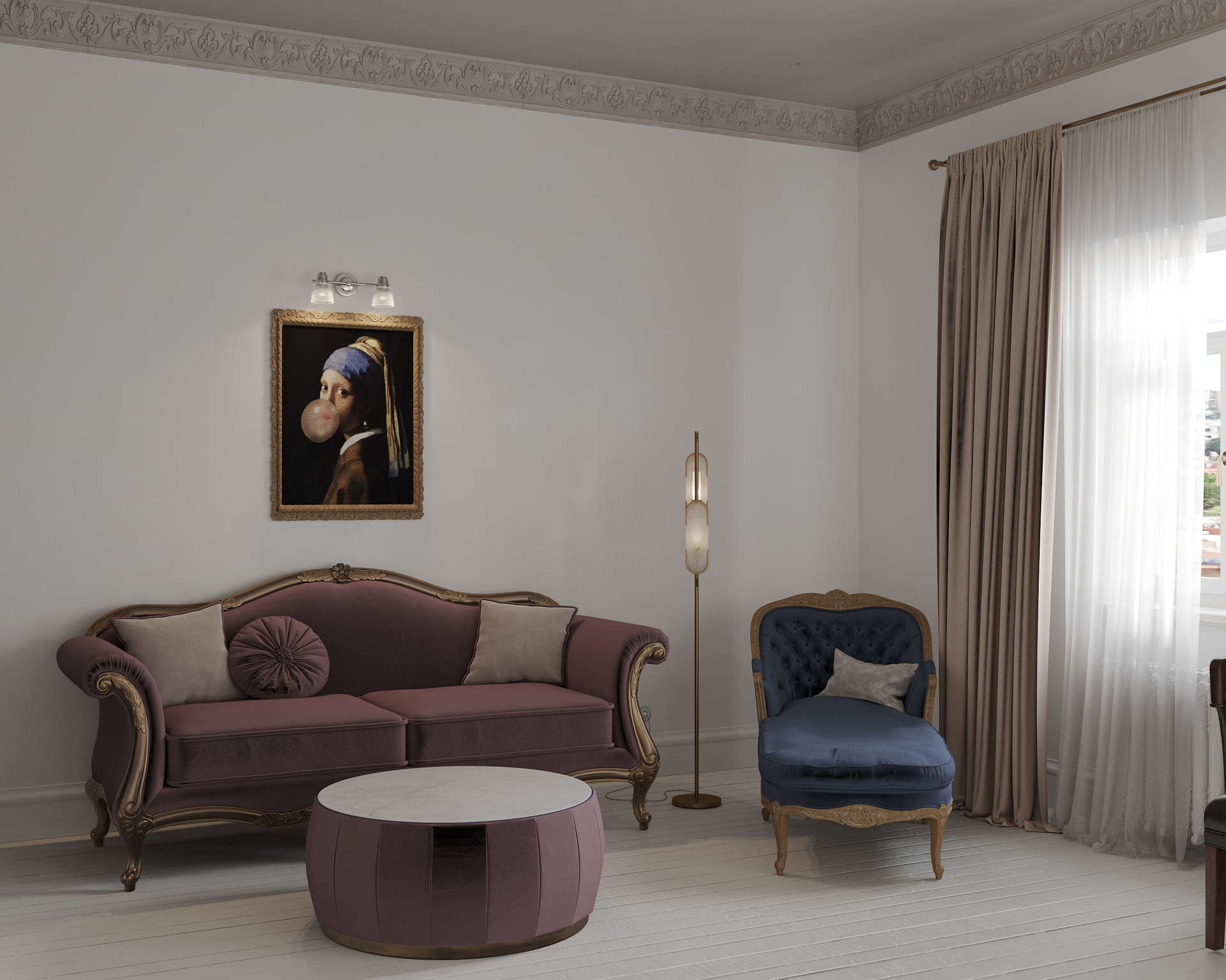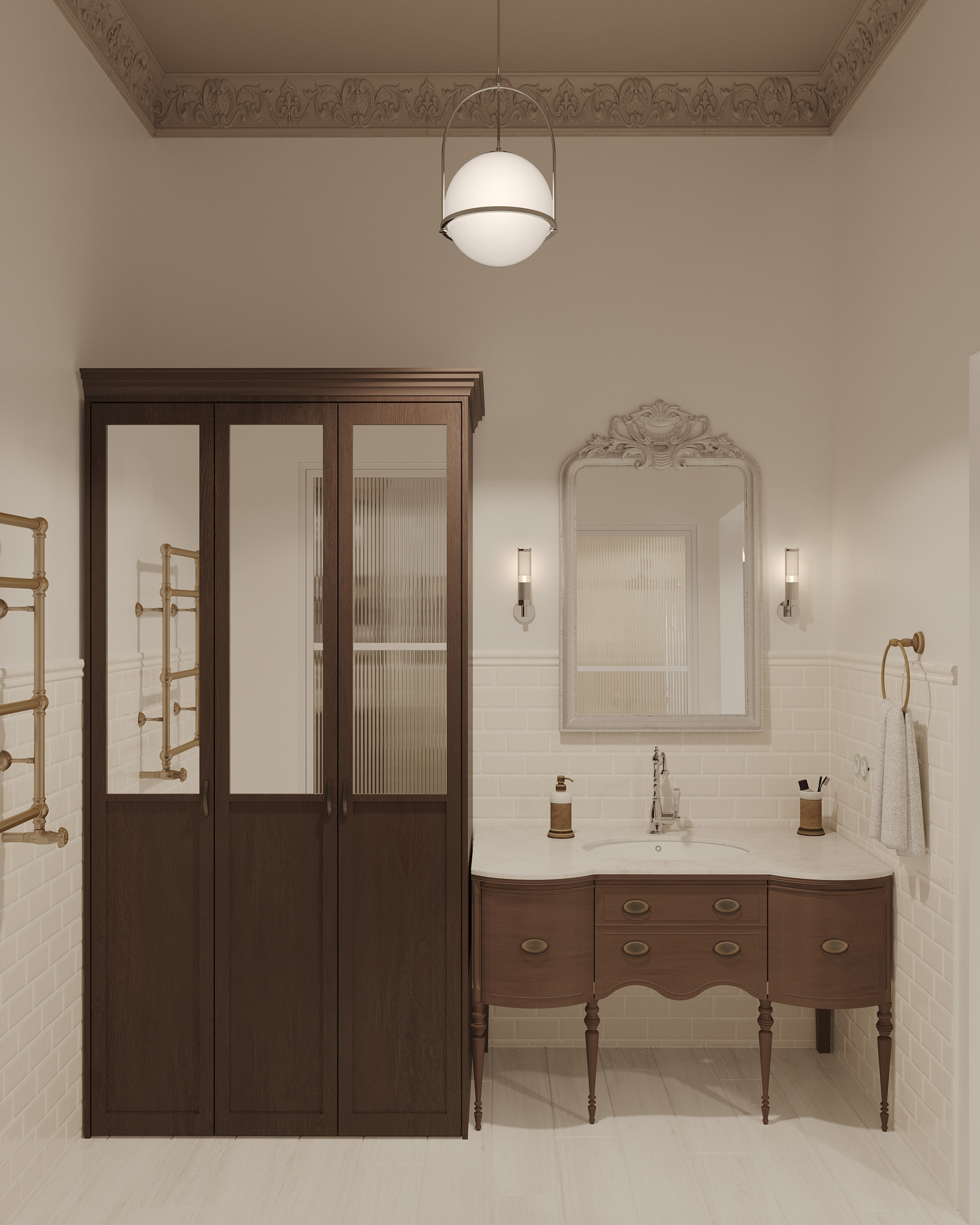 An aesthetical classic design apartment based in the center of Vilnius with the standard for this place being high ceilings and brushed golden interior details.