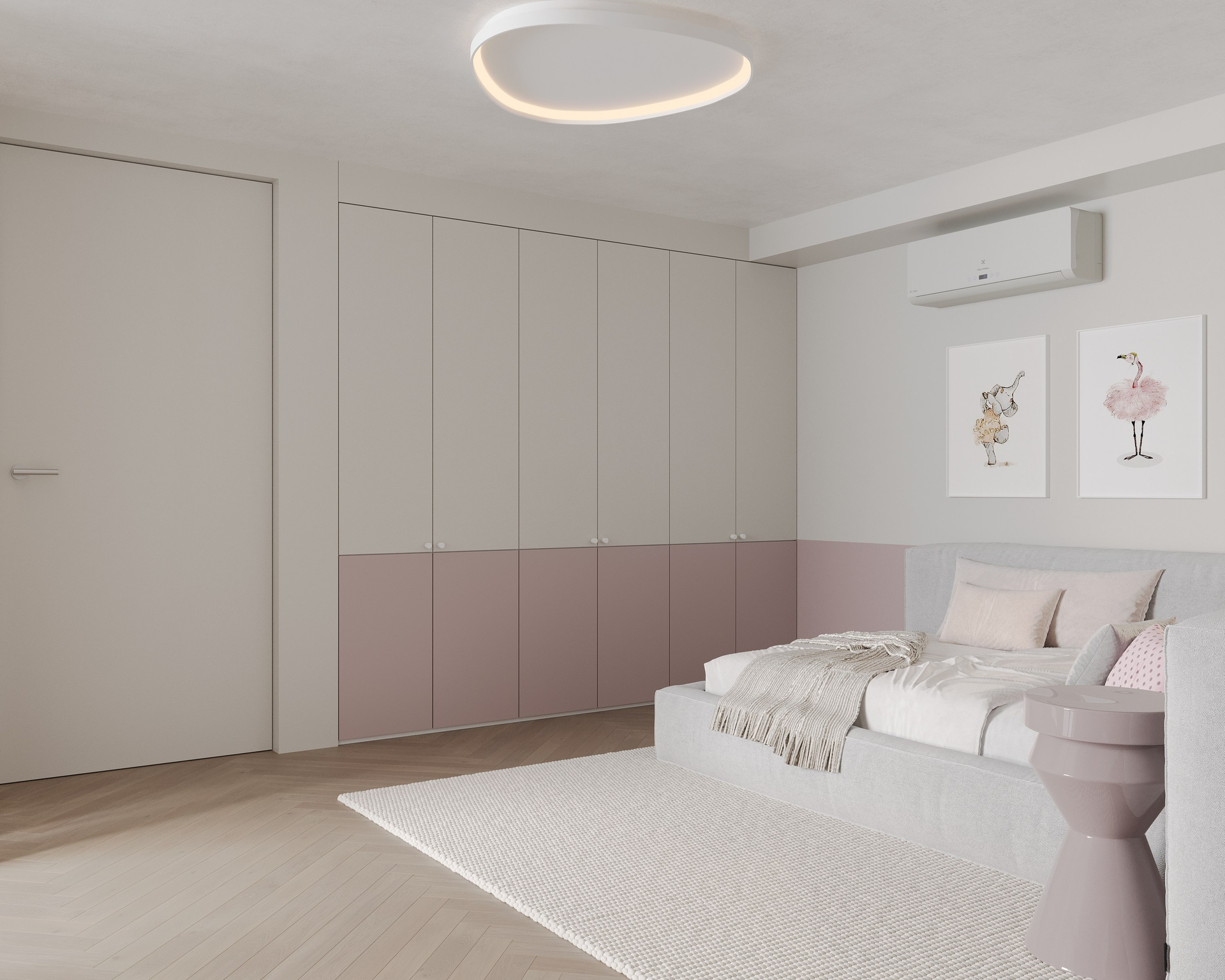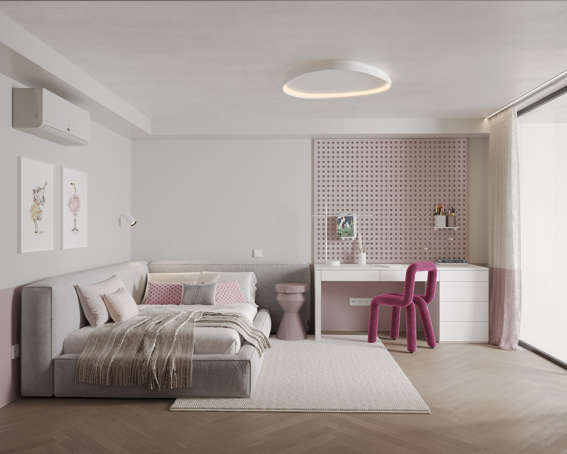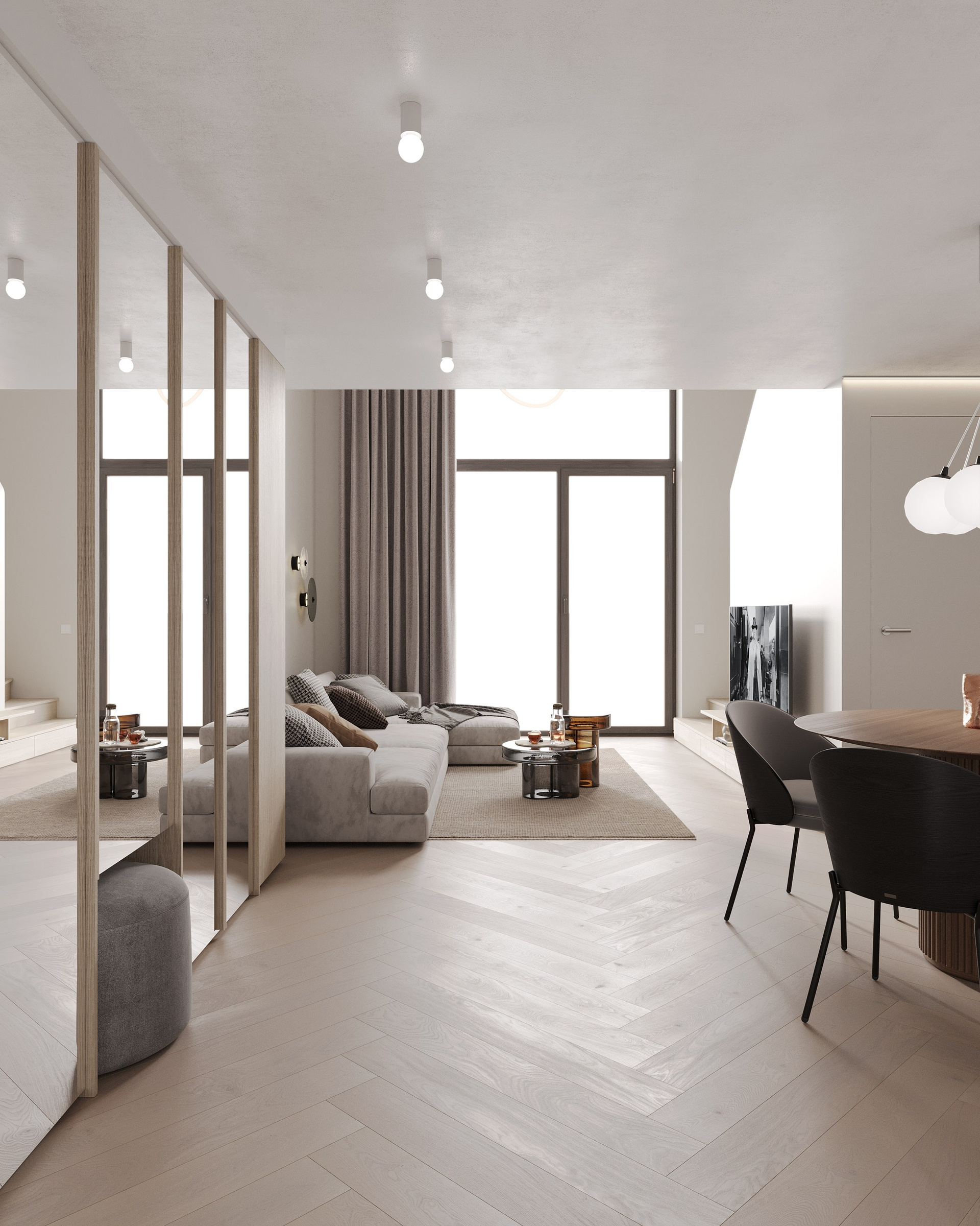Minimalistic and monochrome, loft-type apartment with only one window, but comfortable planning and colorful childroom.