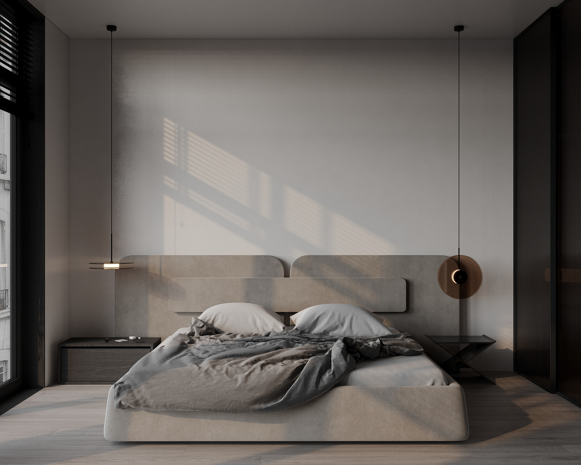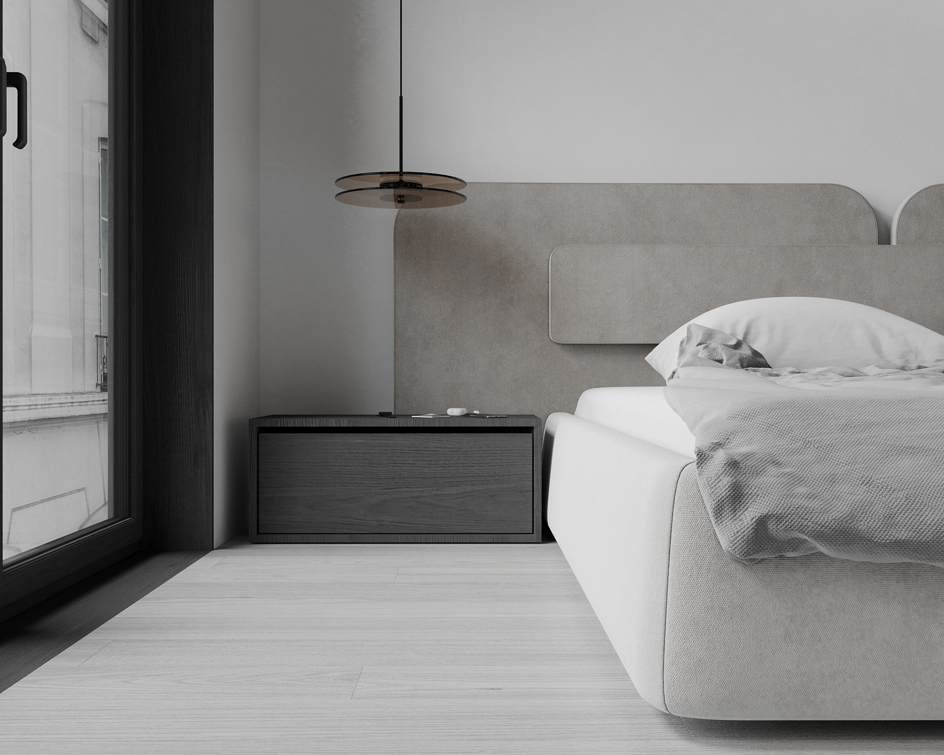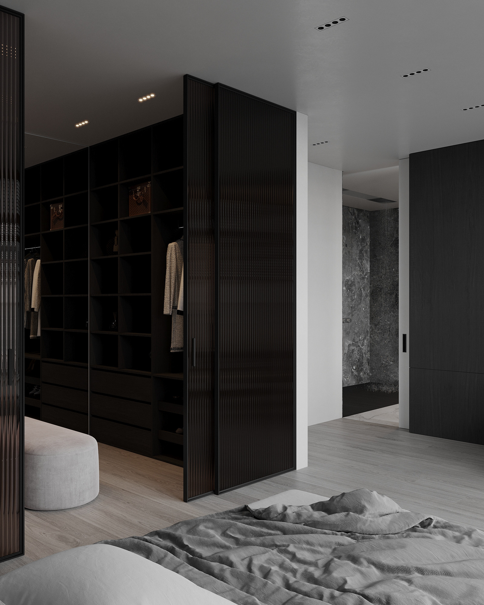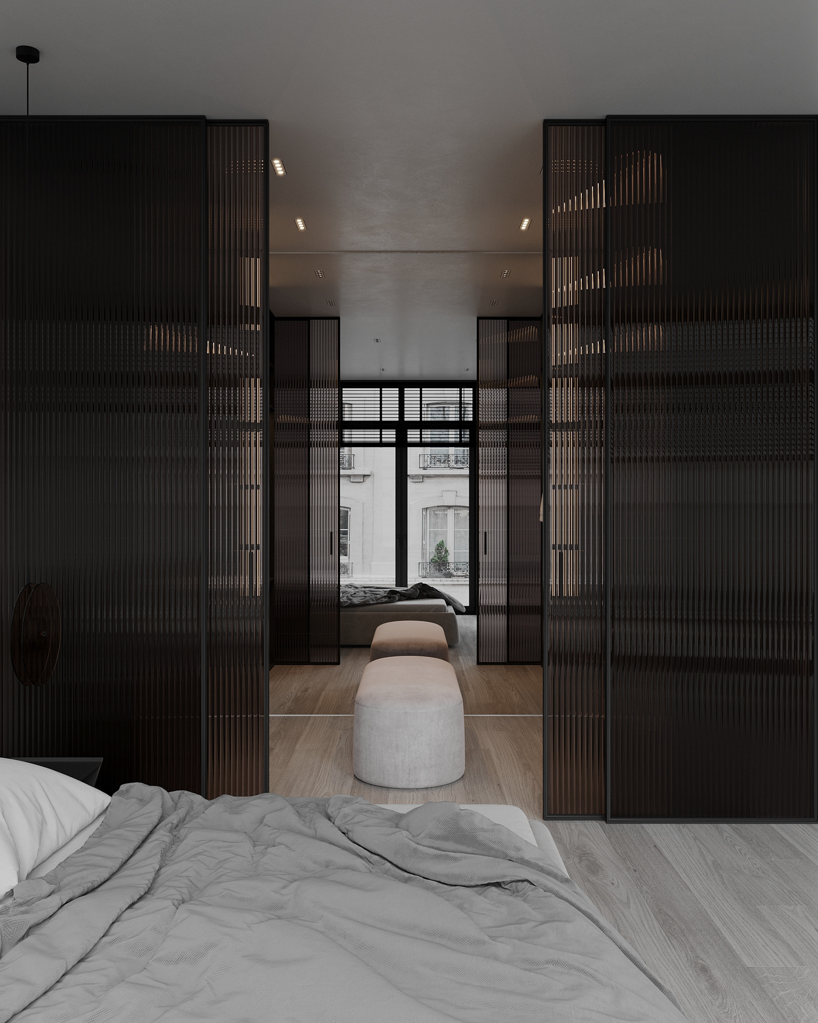 Minimal and aesthetical, bedroom design with lots of glassy items, dark and natural wood also soft velour interior elements.