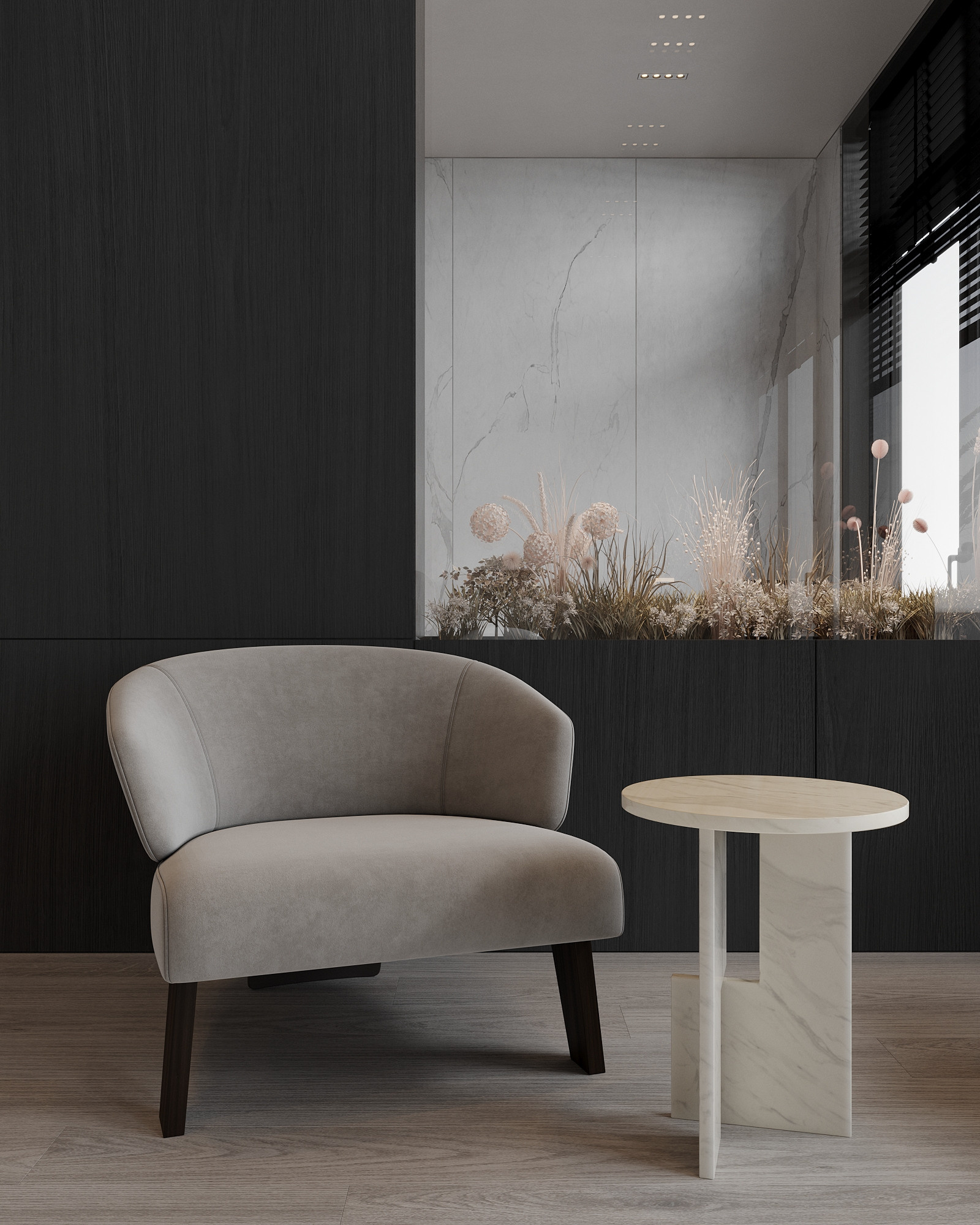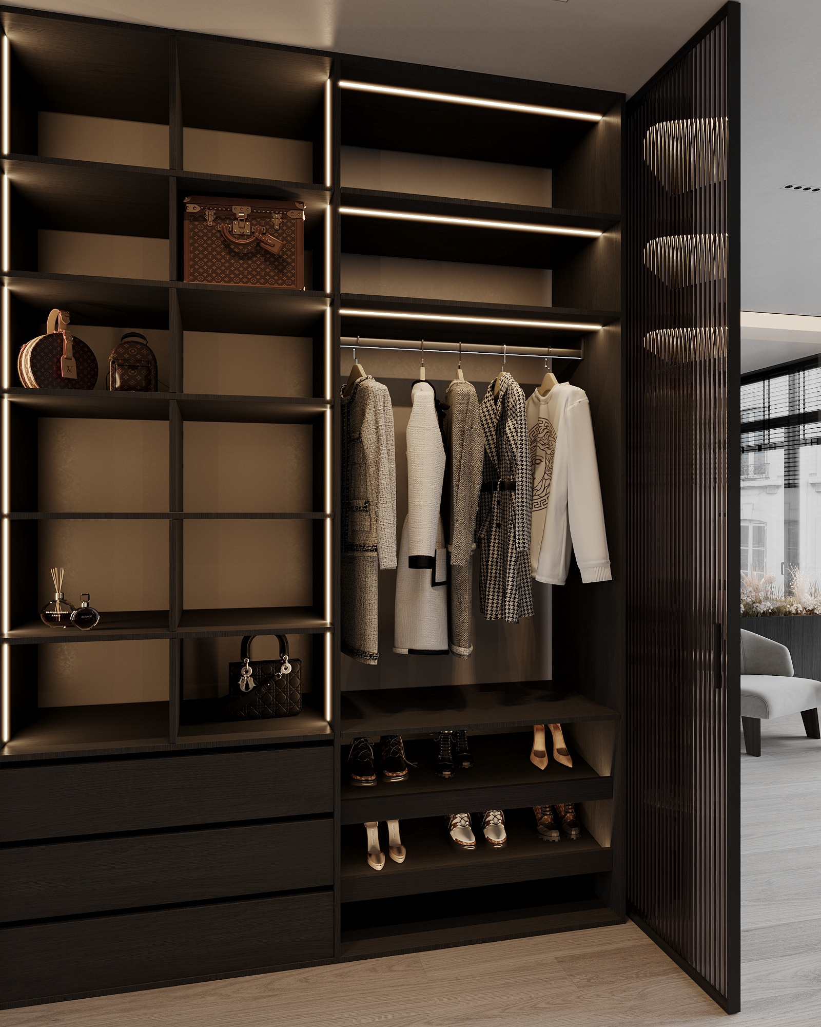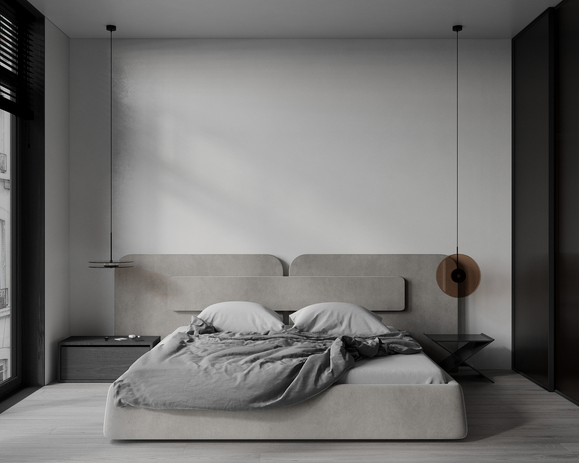 Minimal and aesthetical, bedroom design with lots of glassy items, dark and natural wood also soft velour interior elements.