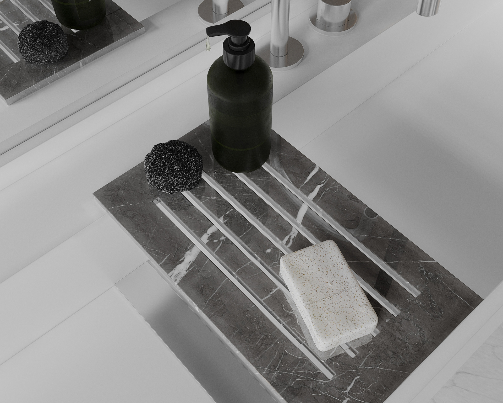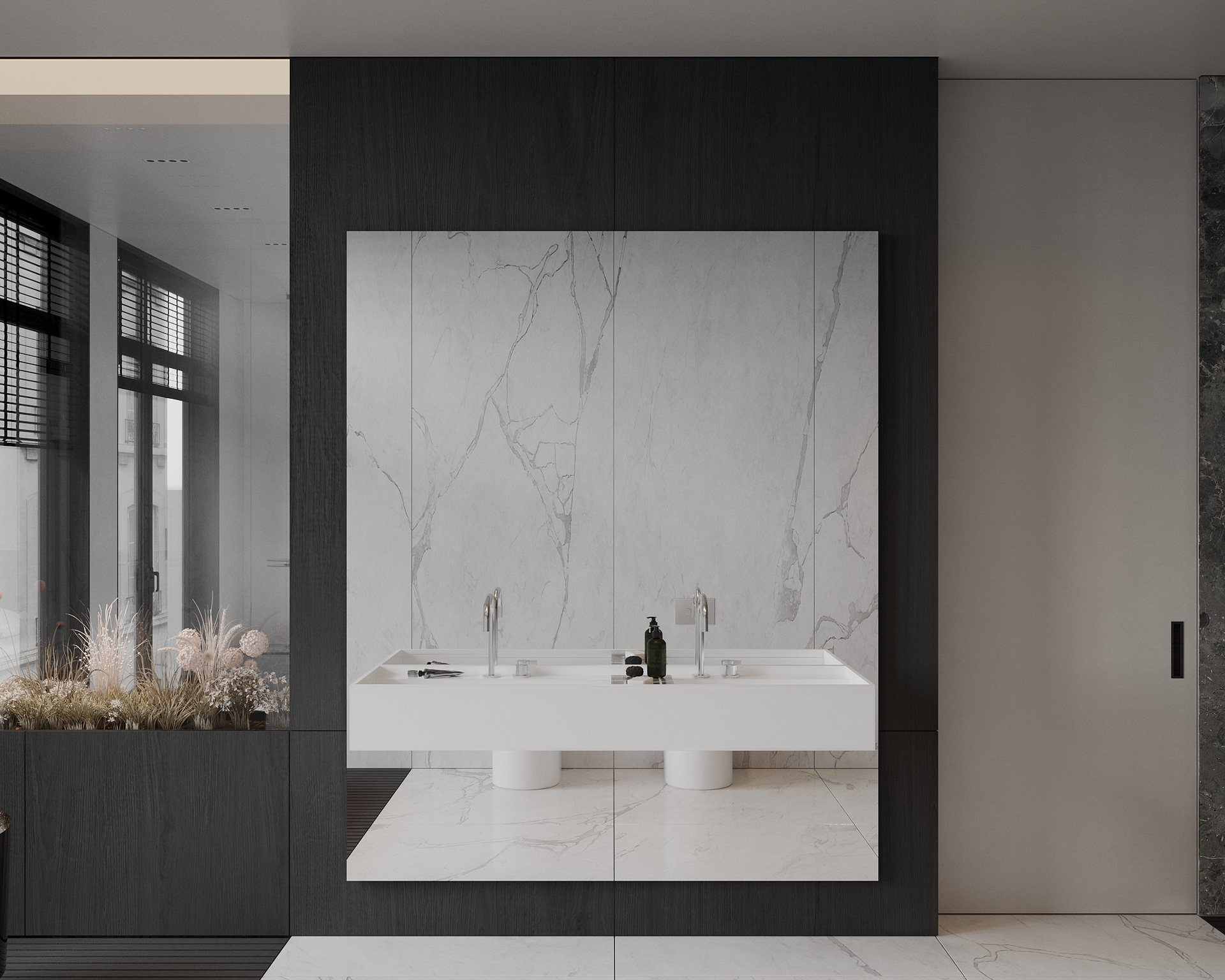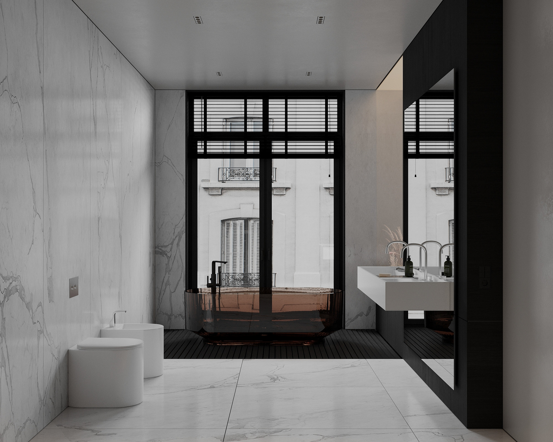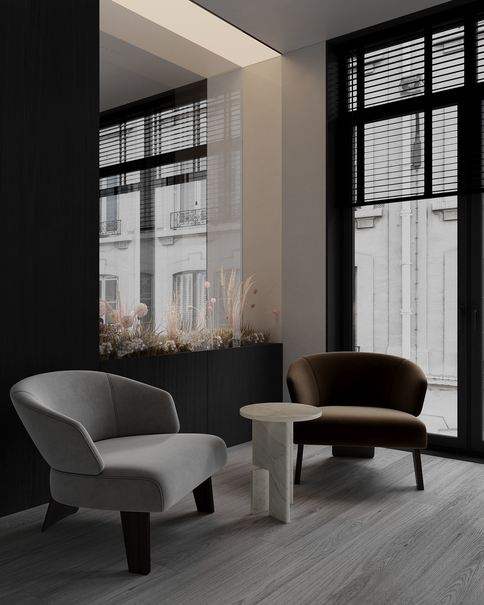 Minimal and aesthetical, bedroom design with lots of glassy items, dark and natural wood also soft velour interior elements.