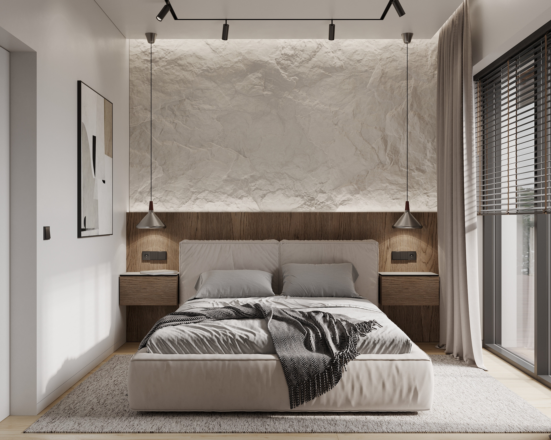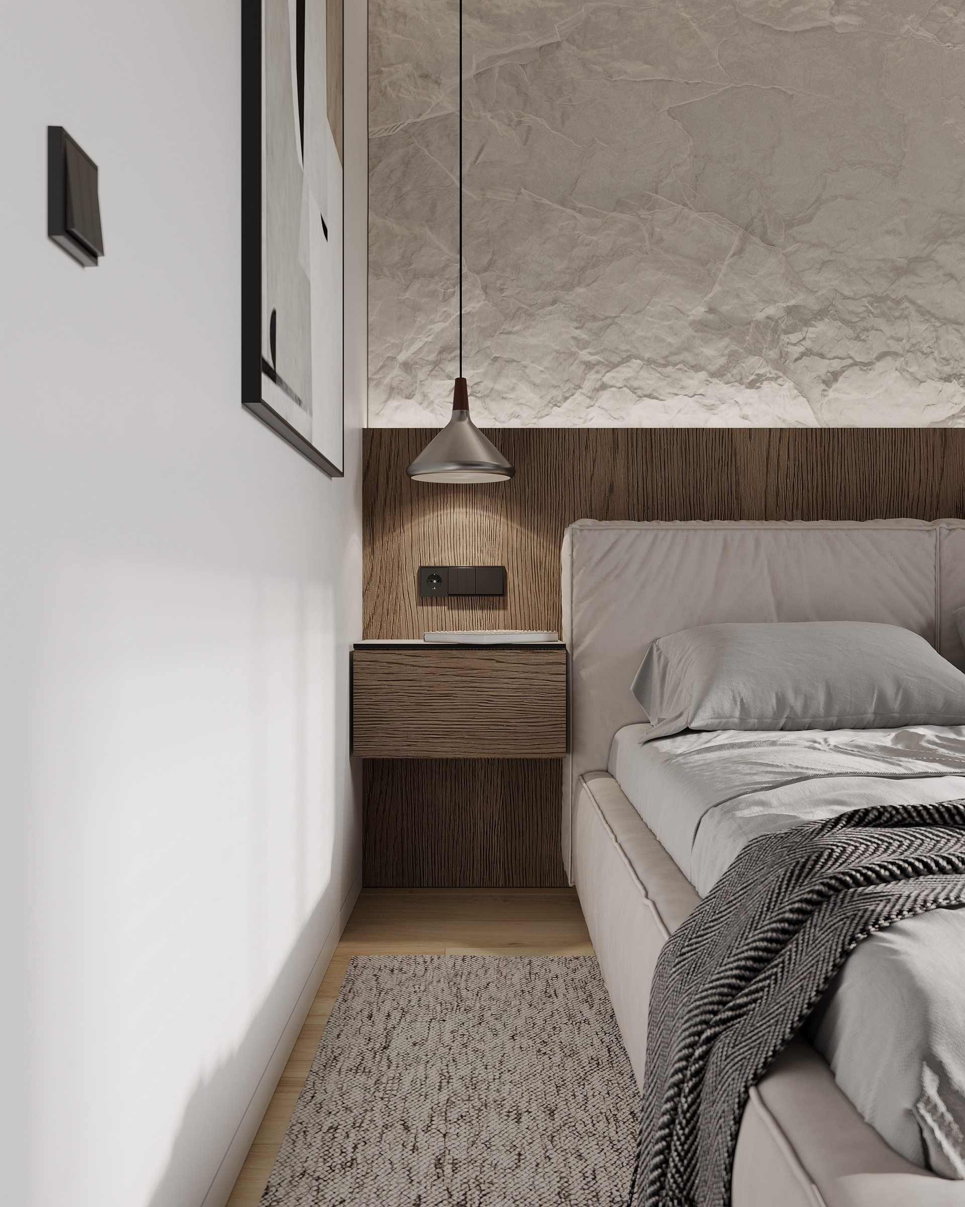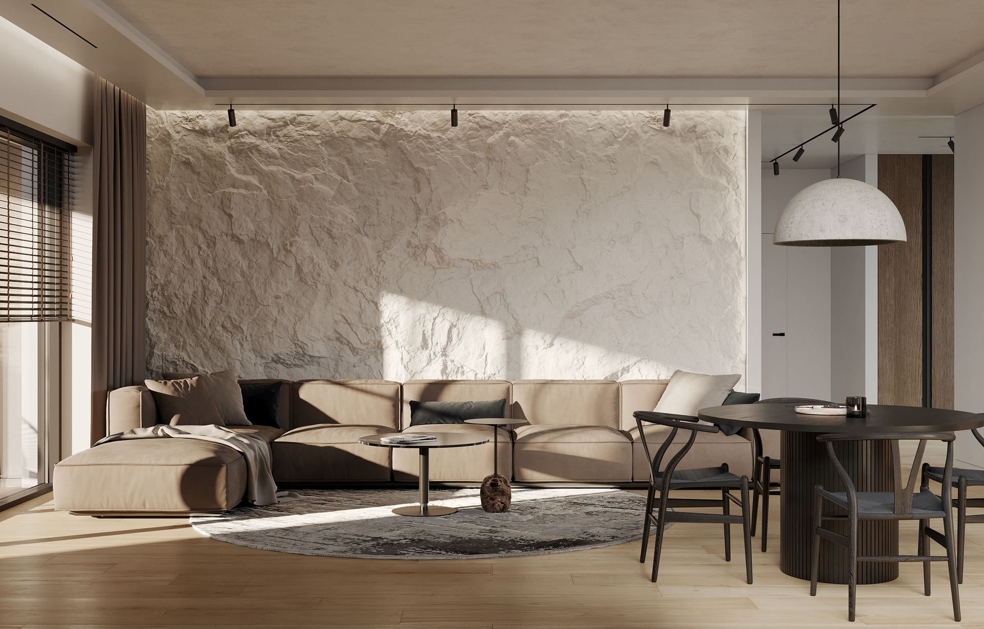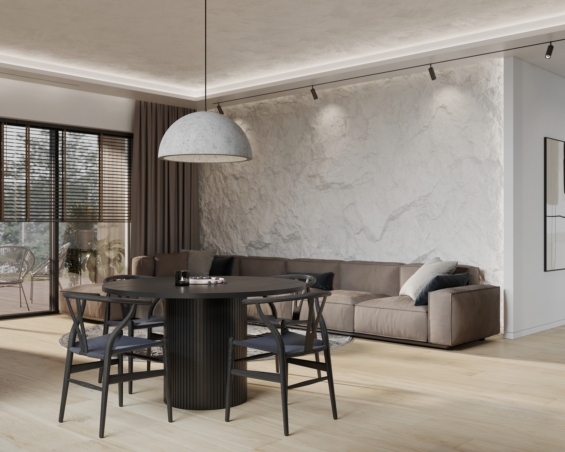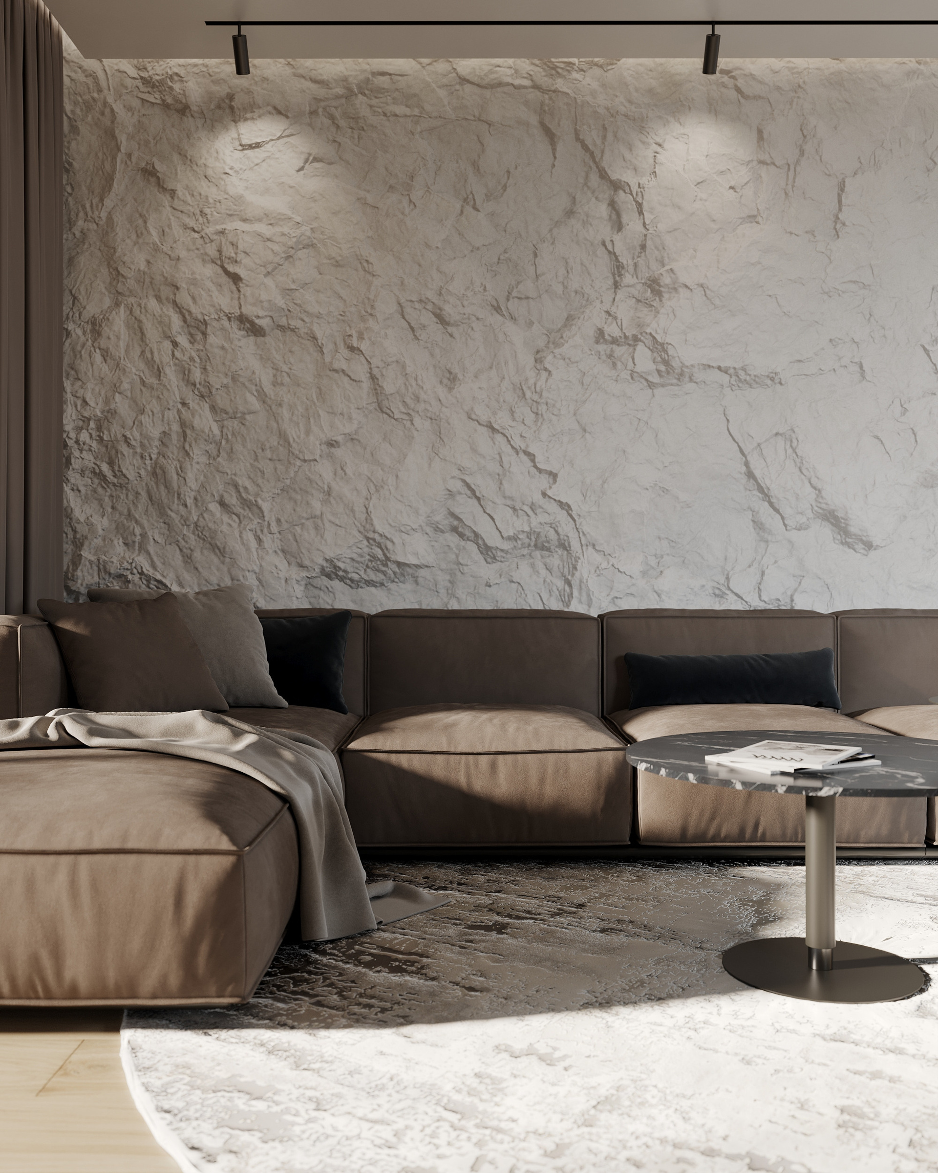 This interior project is distinguished by the use of non-traditional stone imitation decor walls in the interior. This solution is repeated in all the main spaces of the house (living room, bedroom, even the bathroom). The interior is dominated by light colors (white, gray, beige), concrete, stone decor, and a lot of wood used for all the main cabinet furniture and wall decor.