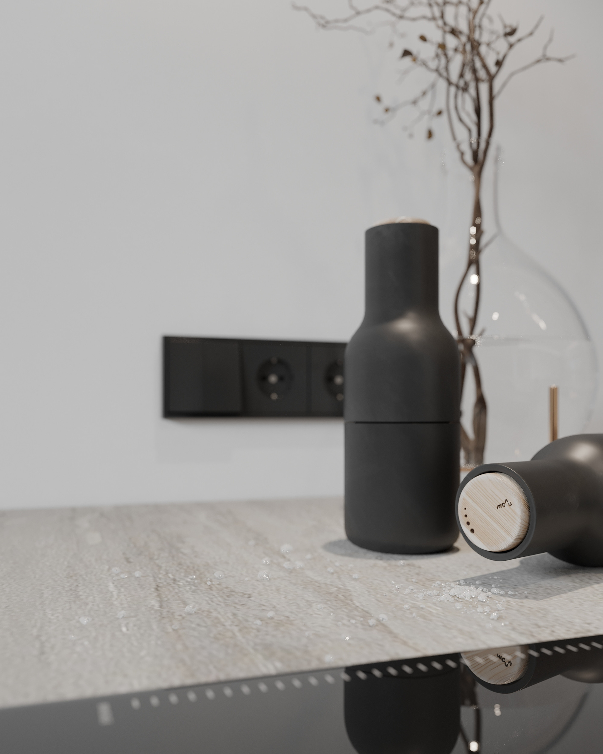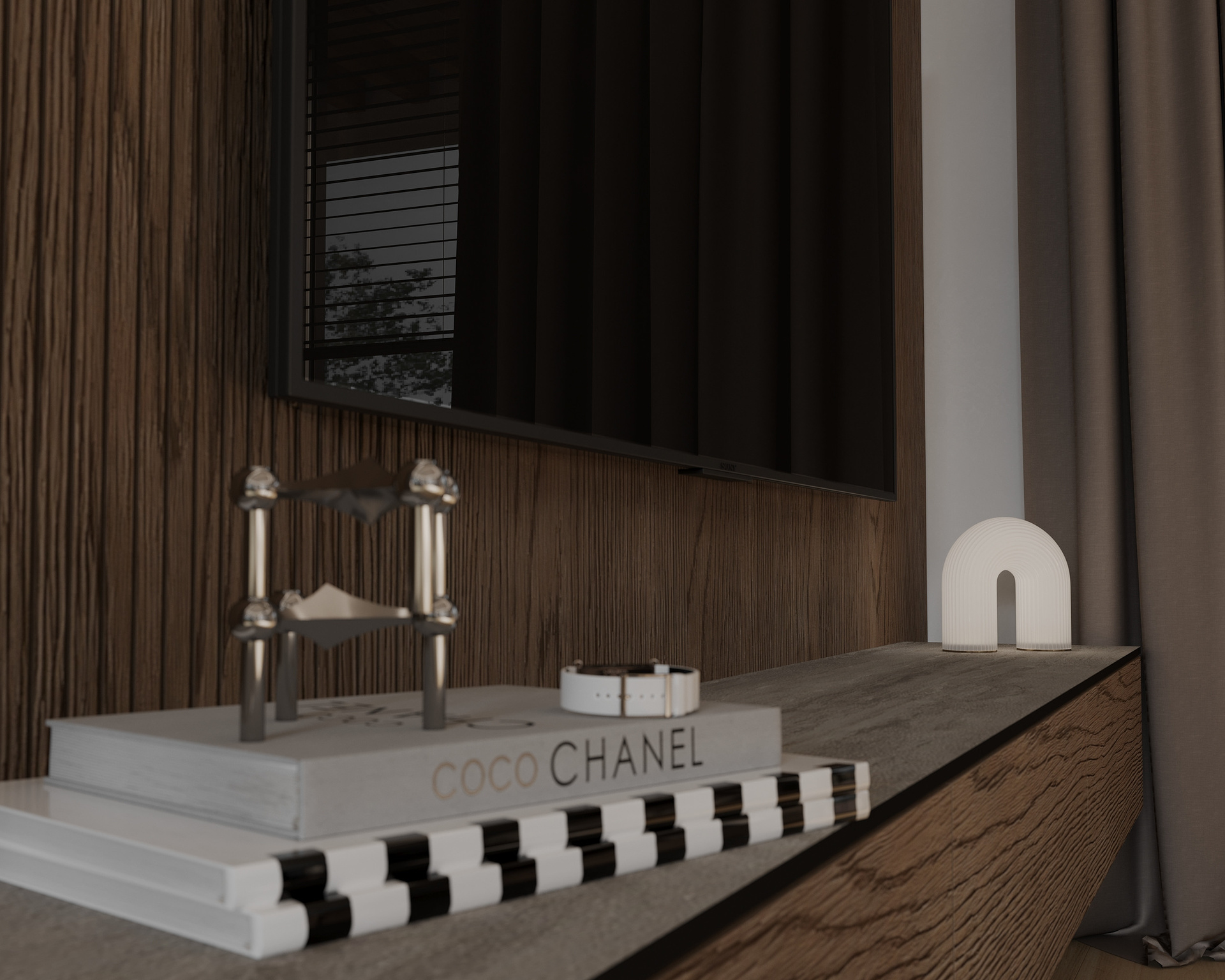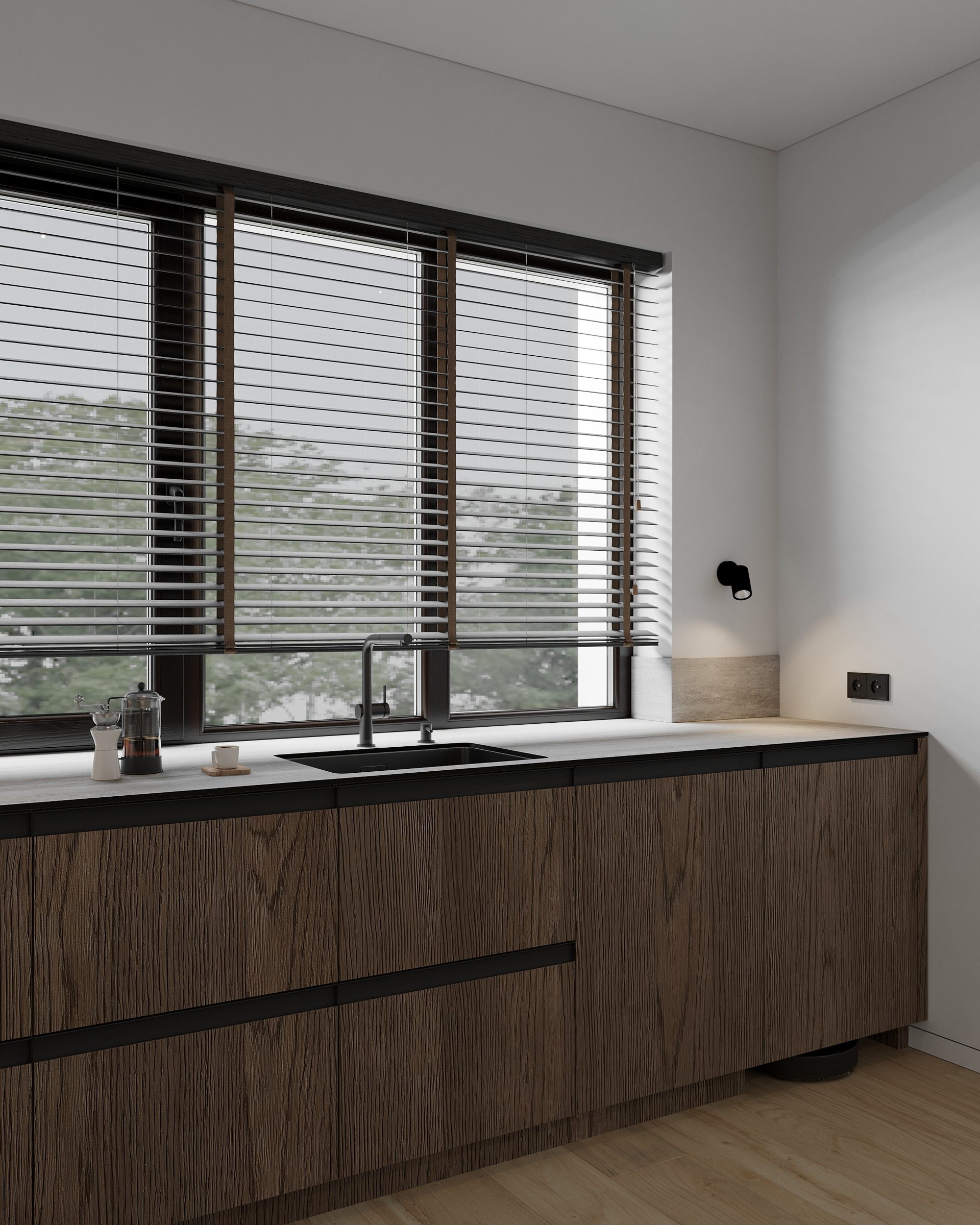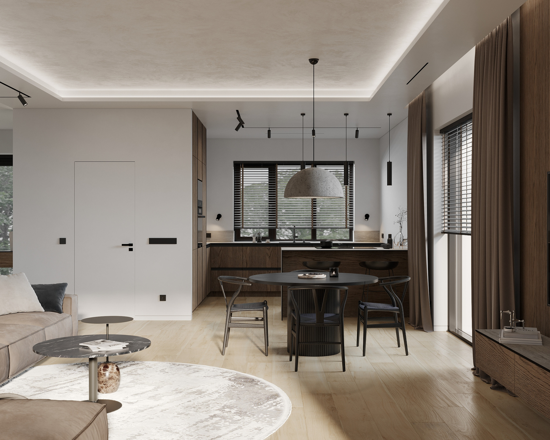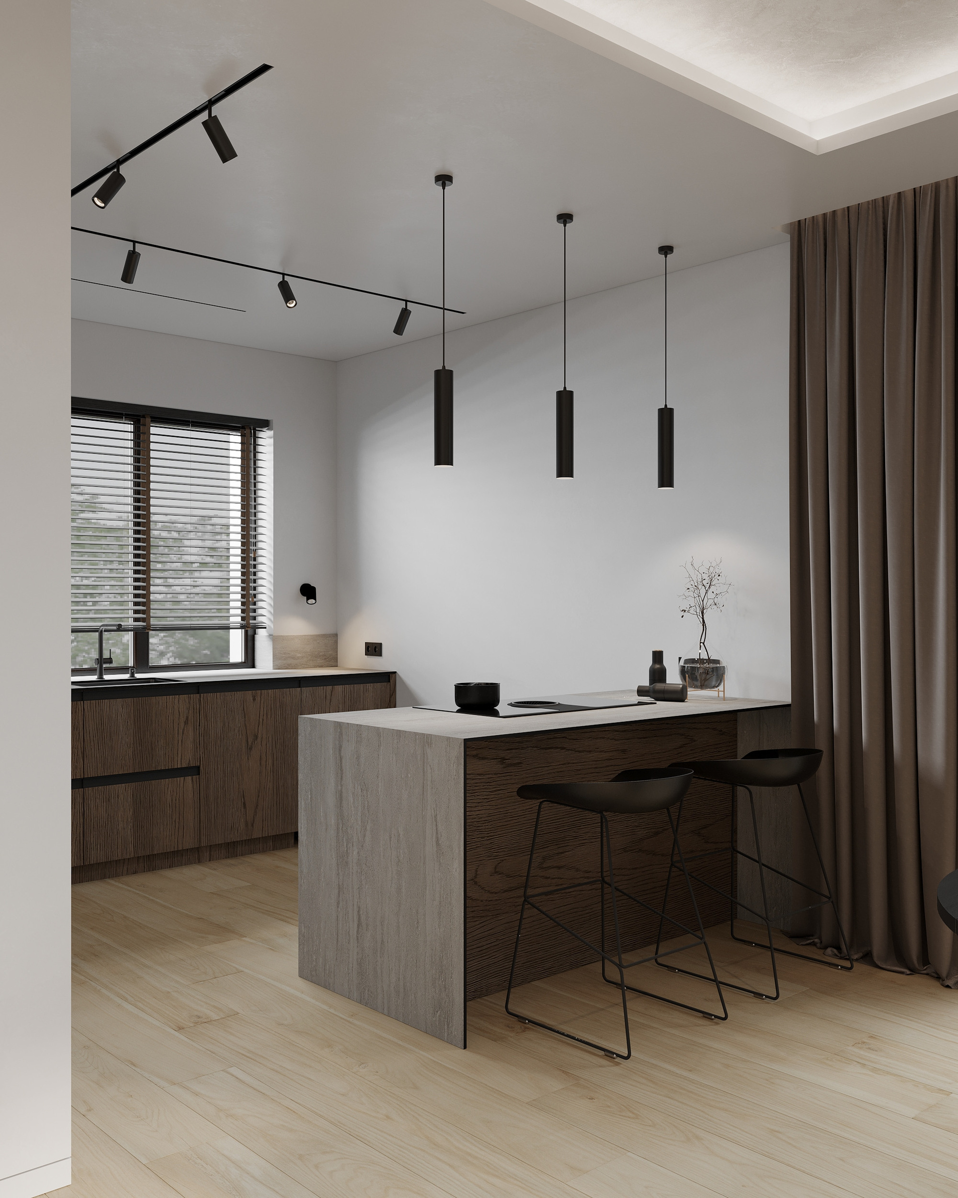 This interior project is distinguished by the use of non-traditional stone imitation decor walls in the interior. This solution is repeated in all the main spaces of the house (living room, bedroom, even the bathroom). The interior is dominated by light colors (white, gray, beige), concrete, stone decor, and a lot of wood used for all the main cabinet furniture and wall decor.