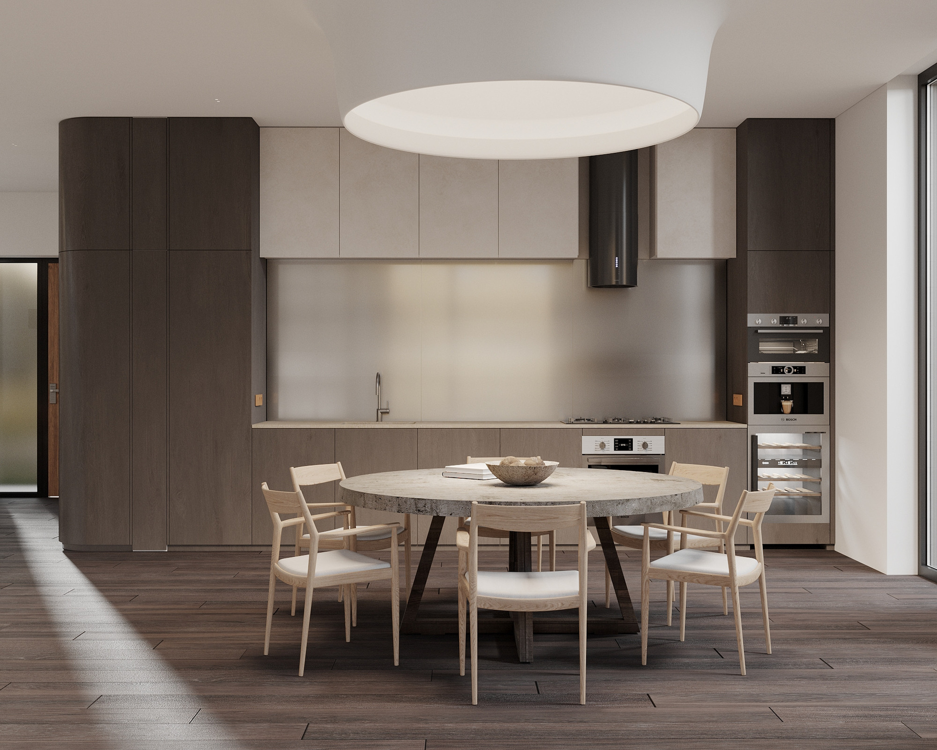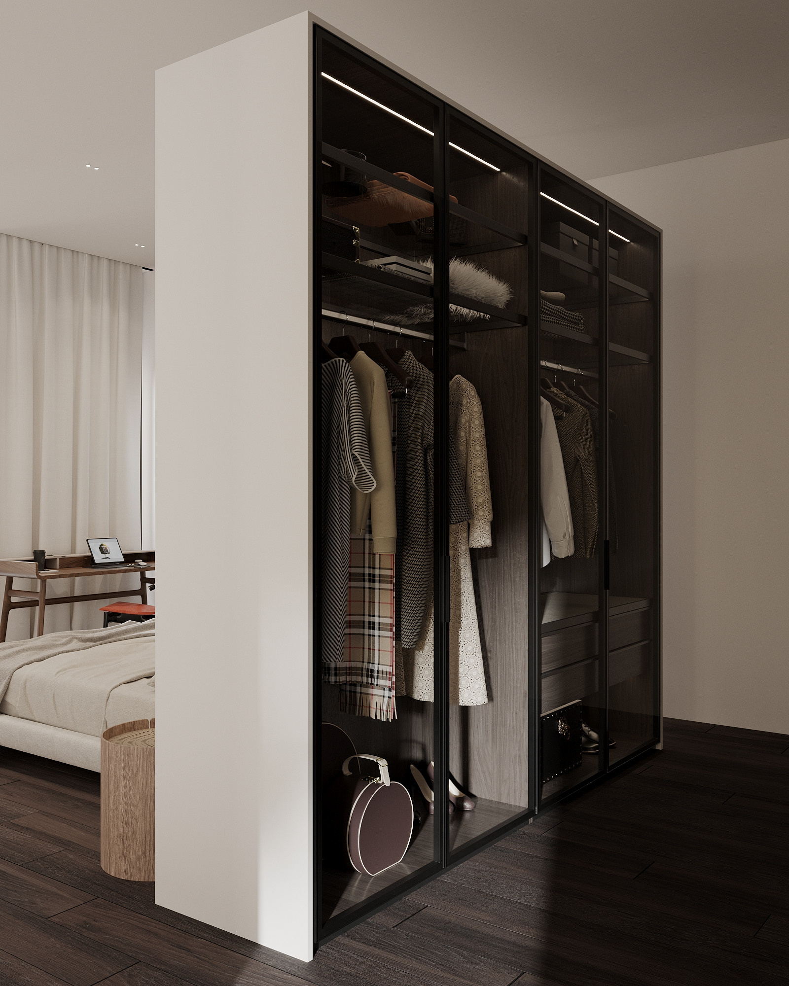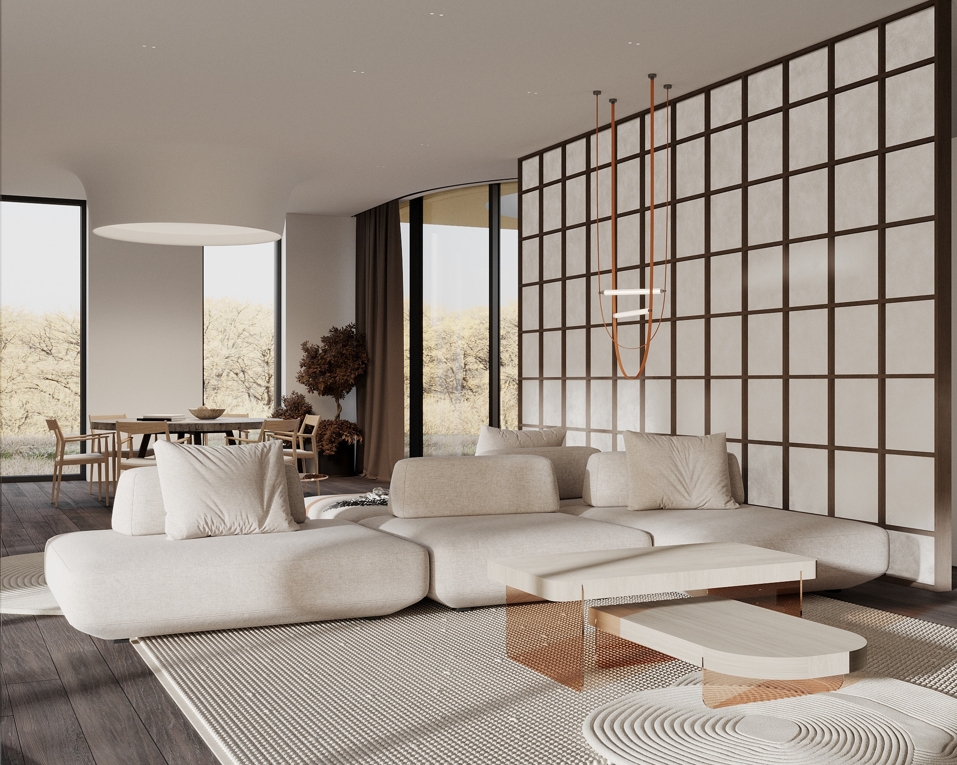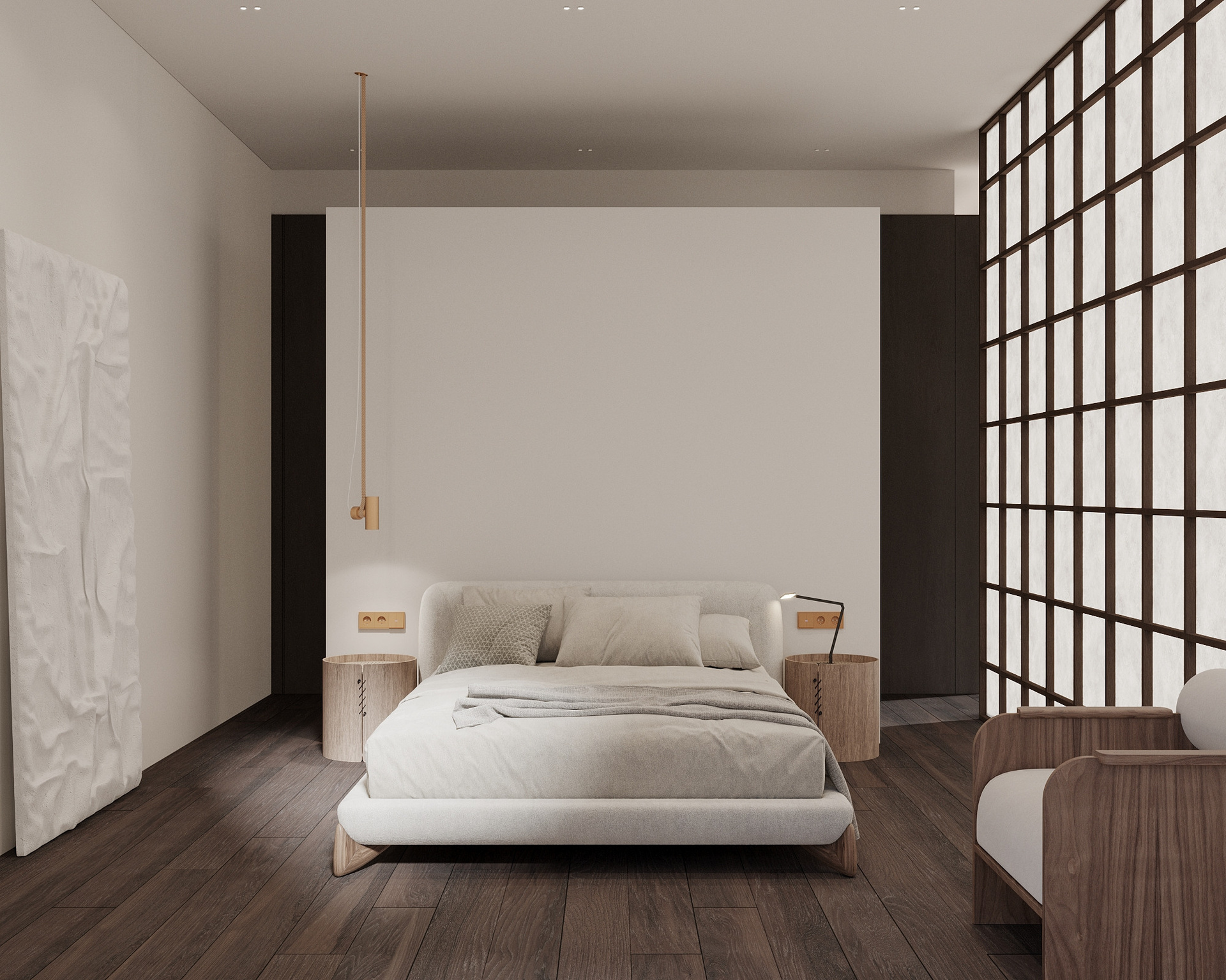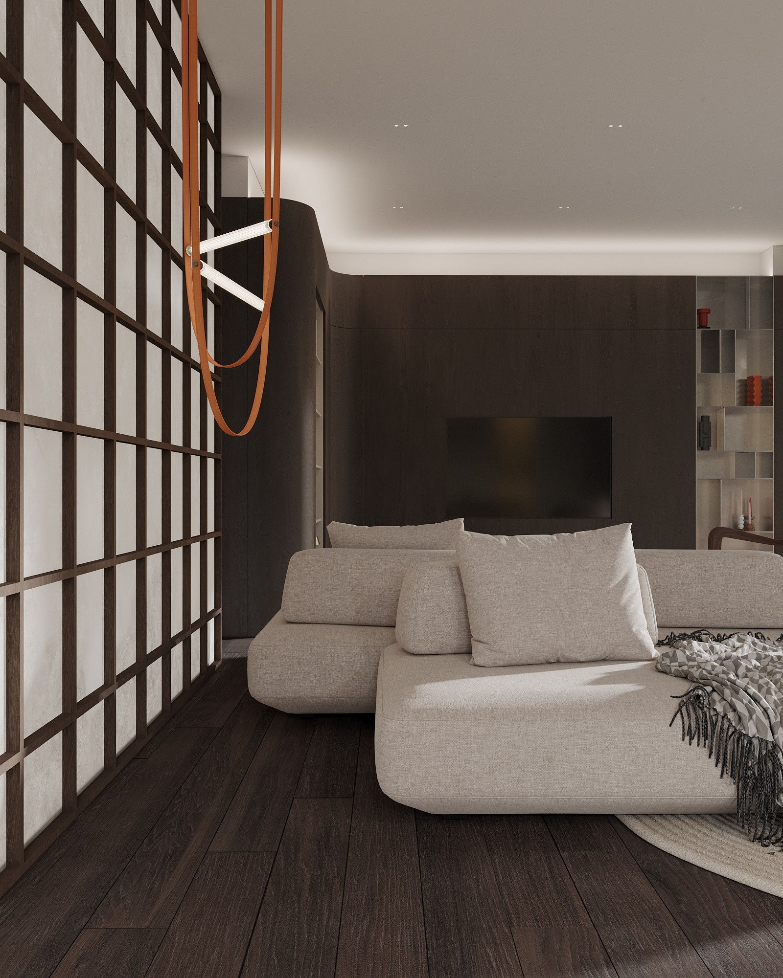 Master bedroom and dining/ living room zones are separated by decor wall with integrated soft light in it.